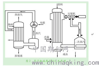MVR系統(tǒng)主要由蒸發(fā)器和結(jié)晶器組成,廢水首先經(jīng)過蒸發(fā)器系統(tǒng)進(jìn)行濃縮,然后將循環(huán)結(jié)晶器進(jìn)一步的強(qiáng)制濃縮結(jié)晶。通過固液分離將鹽和水分開后分別進(jìn)行回收利用。MVR技術(shù)的原理和工藝流程如圖2所示。高鹽廢水進(jìn)入蒸發(fā)器中的進(jìn)料罐,調(diào)節(jié)pH值至弱酸性后被送至逆流板式蒸餾水換熱器進(jìn)行加熱,溫度升至接近沸點(diǎn)時(shí),進(jìn)入除氧器。在除氧器內(nèi),噴灑在填料上的廢水逐級向下流動,與逆流而上的蒸汽相接觸,脫除不凝氣體,然后從底部排出,進(jìn)入蒸發(fā)器底槽,與循環(huán)的濃鹽水混合。混合后的濃鹽水被送至蒸發(fā)器的頂部管箱并進(jìn)入垂直管道,沿管道內(nèi)壁均勻地呈薄膜狀下降。在這個過程中,一部分水吸收管外蒸汽釋放的熱能蒸發(fā),產(chǎn)生的蒸汽與未蒸發(fā)的濃鹽水一起下降至蒸發(fā)器底槽。蒸餾水流經(jīng)換熱器時(shí),對新進(jìn)的高含鹽廢水加熱。為控制蒸發(fā)器內(nèi)濃鹽水的總?cè)芙夤腆w含量,濃縮器底槽內(nèi)的部分濃鹽水被排放至結(jié)晶系統(tǒng)中進(jìn)行結(jié)晶處理。